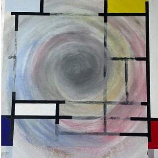 Ook besloten om het werk vierkant te maken, dit maakt de referentie naar Mondriaan duidelijker. De compositie van een cirkel in een vierkant leidt de kijker ook nog sterker naar het oog van de maalstroom toe.
