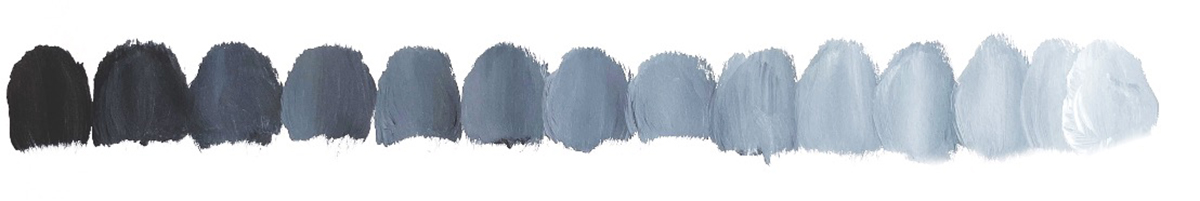 Maak en overgang van zwart naar wit zonder daarbij ivoorzwart te gebruiken. Maak het zwart door het mengen van je donkerste blauw met gebrande omber en een tipje rood.