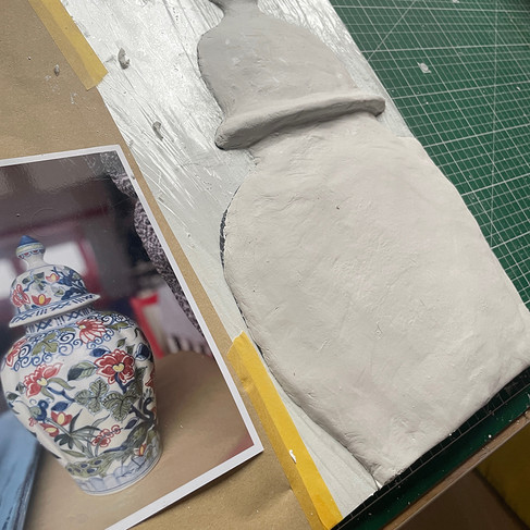 Nu het werk aan de achtergrond klaar is kan ik met het voorplan aan de slag. Ik heb nog lang getwijfefeld over de compositie. Wordt het landscape of portrait...? Voeg ik de vaas volledig en gecentreerd toe...? Of toch een uitsnede...? Ik kom in ieder geval uit op een vaas in 3d, zodanig dat alles binnen het silhouet van de vaas een bolling op het paneel wordt. Het combineren van 3d elementen en een schilderij had ik al geruime tijd op mijn "moet-ik-eens-een-keer-proberen" lijstje staan. Eerst een plan bedacht om een 3d printwerk te maken, maar uiteindelijk toch gekozen voor aan de lucht drogende klei.