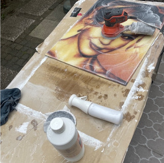 Met polijstpasta en een polijstpad de glans gaan terugbrengen. Tussentijds gekoeld met een plantenspuit met water om oververhitting te voorkomen.