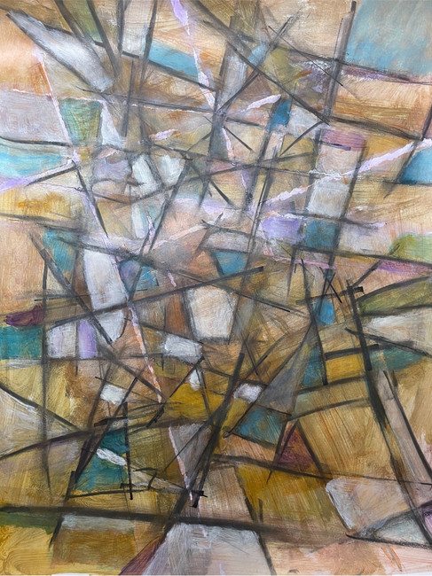 Daarna de vlakken en vlakjes gaan inschilderen met zinkwit, en met veel matte medium vermengde oker, koper, Phtaloblauw en violet.