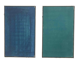 Voor de achtergrond heb ik twee acrylverf werken gebruikt waar met een Liquitex Freestyle Paddle de kleuren Kobaltblauw, Turkooisgroen, Titaniumwit en licht Ultramarijn tegen- en door elkaar gesmeerd zijn.